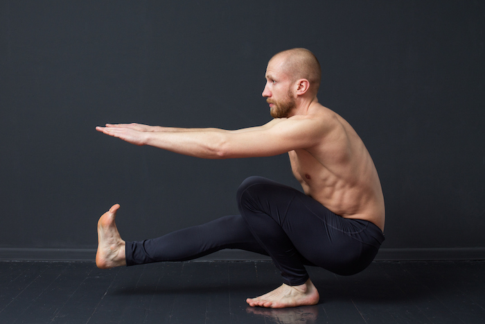 Du börjar med att lyfta en av fötterna och håller detta ben sträckt, en bit ovanför underlaget. Böj på det stödjande benet och gå ned till huksittande. Ta gärna hjälp av armarna genom att sträcka fram dessa så att du fördelar ut vikten till förmån för balansen. Pressa dig sedan tillbaka upp till utgångsläget och upprepa med det andra benet.