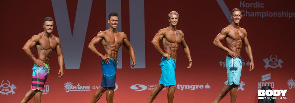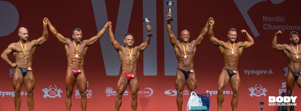 Deivid Lopes Da Silva vann Bodybuilding -80kg, här omgiven av (fr v) Robin Elliot, Allan Lund, Renan Kada, Robert Ekblad och Kamaludin Jalaledin.