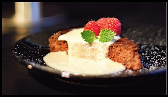 - Servera chokladkakan lätt avsvalnad tillsammans med vaniljkrämen. Toppa eventuellt med färska hallon och strö lite sötningsströ över kakan.