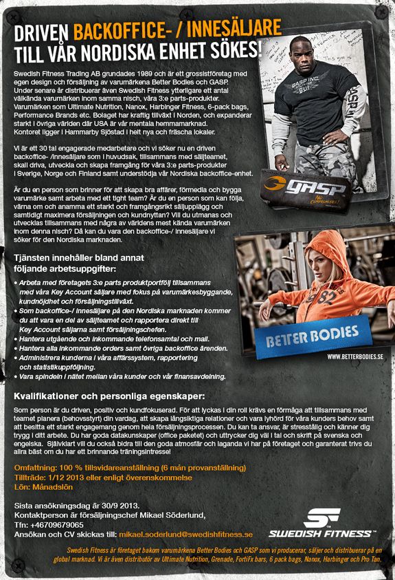 Swedish Fitness med varumärkena Better Bodies och GASP skriver: ”Är du en person som brinner för att skapa bra affärer, förmedla och bygga varumärke samt arbeta med ett tight team? Vill du utmanas och utvecklas tillsammas med några av världens mest kända varumärken inom denna nisch? Då kan du vara den backoffice-/innesäljare vi söker för den nordiska marknaden.”