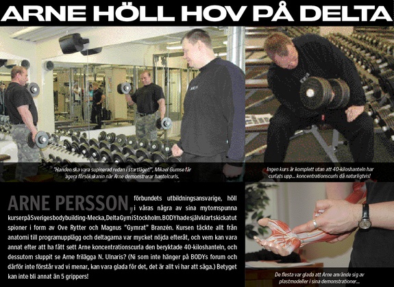 Arne Persson, förbundets utbildningsansvarige, höll i våras några av sina mytomspunna kurser på Sveriges bodybuilding-Mecka, Delta Gym i Stockholm. BODY hade självklart skickat ut spioner i form av Ove Rytter och Magnus ”Gymrat” Branzén.