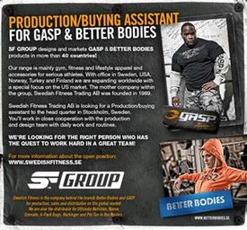 Swedish Fitness med varumärkena Better Bodies och GASP skriver: ”We are looking to strengthen our Production team with an assistant divided between the production / buying and quality control functions. Do you have proven sense of quality in the textile field? Are you a team player? Are you bilingual in Swedish and English? If so, you may be the Production/Buying assistant we are looking for!”