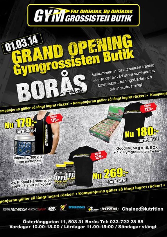 Nu på lördag slår Gymgrossisten Butik Borås upp portarna till ny butik mitt i centrala staden. Invigningsdagen är fylld av kampanjer och erbjudanden mellan 10-17. Besökare kan dessutom mingla med muskelprofiler, bl a Maria Mollstedt från Team Fairing och Samer Dawood som representerar Better Bodies.