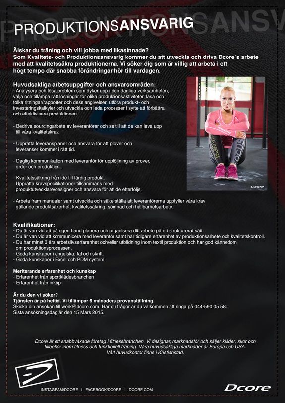 Dcore, verksamt inom sportmode, skriver: ”Älskar du träning och vill jobba med likasinnade? Som Kvalitets- och Produktionsansvarig kommer du att utveckla och driva Dcores arbete med att kvalitetssäkra produktionerna. Vi söker dig som är villig att arbeta i ett högt tempo där snabba förändringar hör till vardagen”.