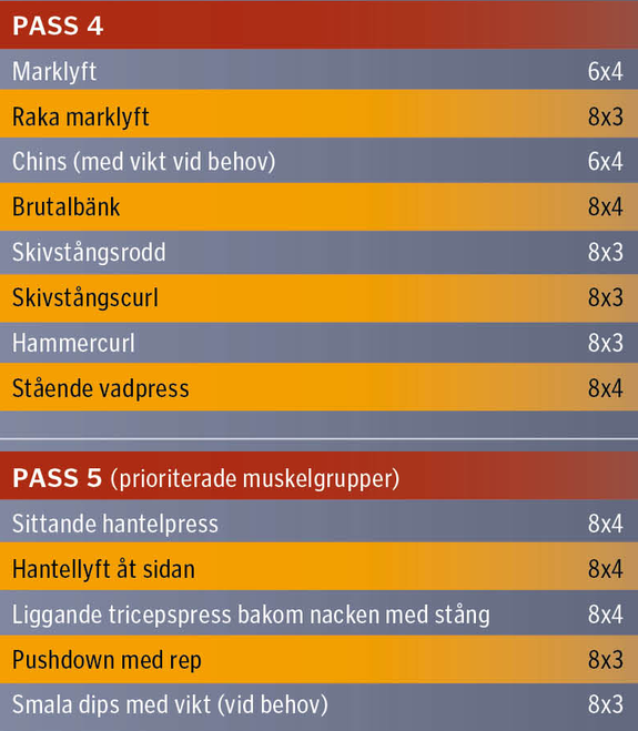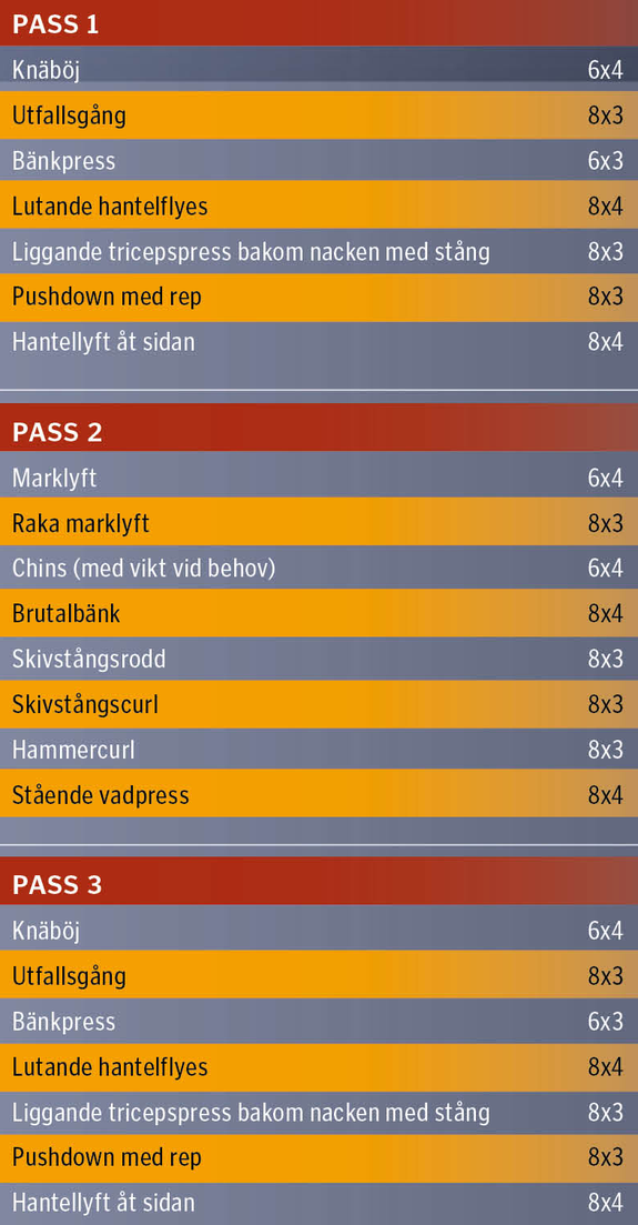 Här följer ett upplägg för dig som vill öka i muskelmassa. I exemplet nedan är det två pass för varje muskelgrupp, plus ett extra pass för prioriterade muskelgrupper. I detta upplägg valdes triceps och axlar som prioriterade muskelgrupper, men detta kan givetvis ändras efter din målbild.