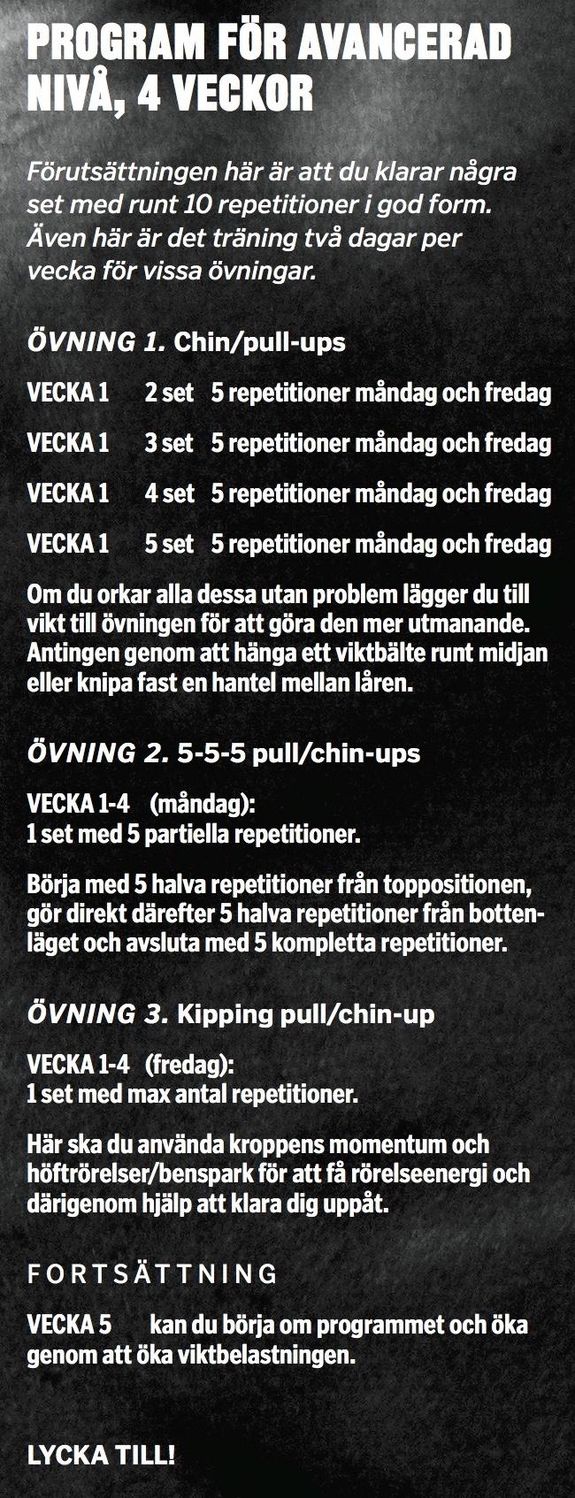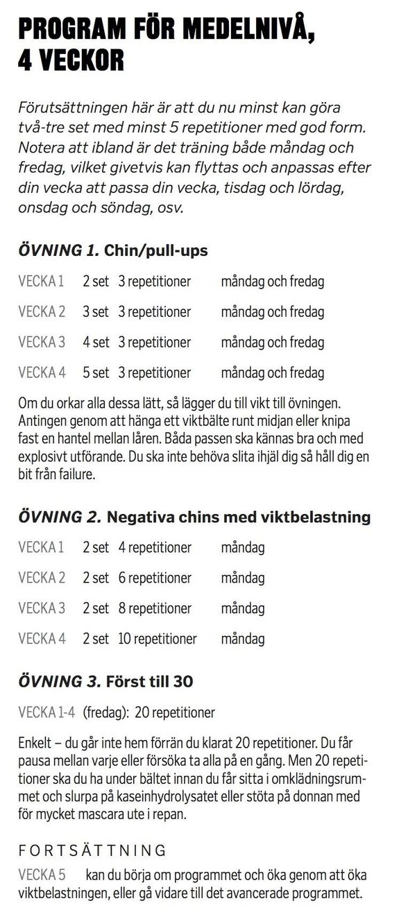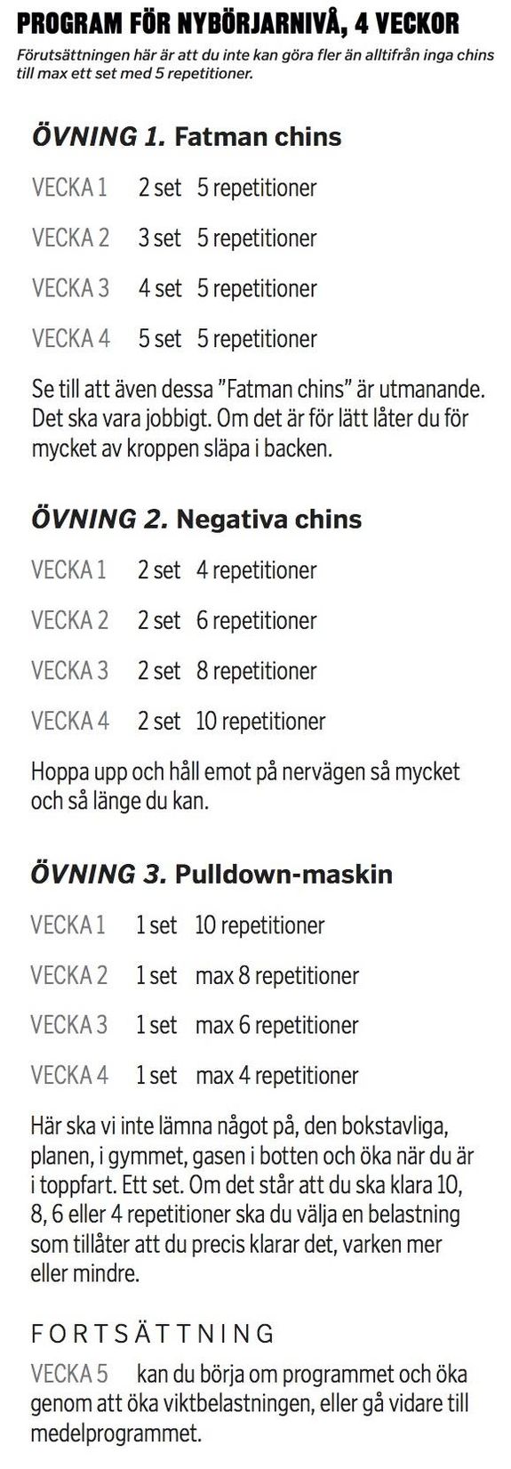 - I undantagsfall (och om du är väldigt långt ifrån att göra en chin/pullup – använd dig av en pulldown-maskin till dess att du kan hantera vikter i närheten av din kroppsvikt).