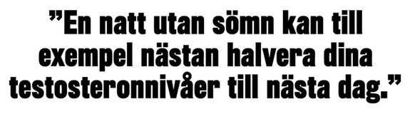 Få saker är så viktiga för god hälsa som tillräcklig sömn. I den här artikeln tänker jag dock inte gå igenom alla fördelar, utan endast fokusera på en, testosteron. Det är nämligen så att den största utsöndringen av testosteron under ett dygn sker just när du sover (29). För lite sömn verkar därför kunna leda till färre timmar med höga testosteronnivåer, och dessutom att du vaknar med mindre testosteron i kroppen de dagar då du sovit för lite (30). En natt utan sömn kan till exempel nästan halvera dina testosteronnivåer till nästa dag (32).