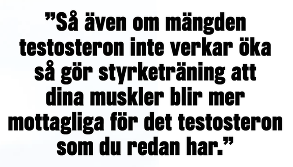 Vad som dock kan förändras i positiv riktning av styrketräning är antalet receptorer i musklerna som känner av testosteron. Så även om mängden testosteron inte verkar öka så gör styrketräning att dina muskler blir mer mottagliga för det testosteron som du redan har (23).