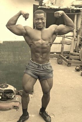 Kulbila Samuel från Ghana visar att en bra fysik går att bygga trots avsaknad av tillgång till ett flashigt gym eller ens vanlig utrustning. Hans muskler har byggts på bakgårdsgym med hemmagjorda redskap.