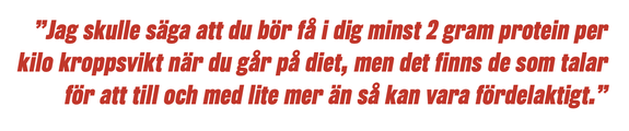 Men kom ihåg att effekten mellan 2 och 3 gram protein per kilo kroppsvikt och dag garanterat är mycket mindre än effektskillnaden mellan 1 och 2 gram per kilo kroppsvikt och dag. Så om du tidigare under diet ätit 2 gram protein per kilo kroppsvikt och dag med goda resultat ska du inte förvänta dig några större effekter av att äta mer än så.