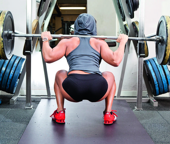 Hon börjar ofta med lätta vikter i en övning och lyfter tills blodet börjar strömma igenom musklerna. Att få muskelkontakt i just knäböj är inte viktigt för henne, där lyfter hon bara tungt utan att tänka så mycket. När hon sedan går över till utfall, benpress och benspark blir muskelkontakten viktigare.