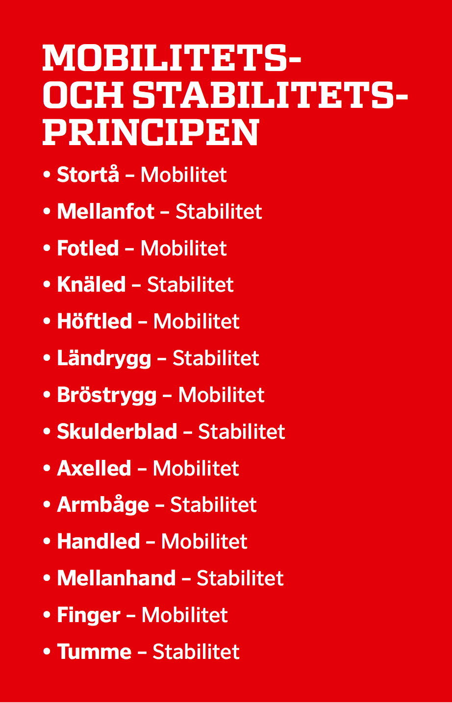 Människokroppens generella behov av rörlighet och stabilitet kan förstås med hjälp av mobilitets- och stabilitetsprincipen (se faktaruta). Den säger att vissa leder framför allt har ett behov av vara rörliga och andra stabila. Utifrån den principen kan du välja övningar för de olika lederna som främjar de två förmågorna.