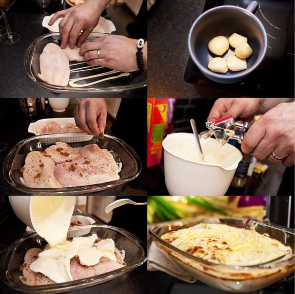 - Rör ner crème fraiche och häll över grädden. Se till att täcka all kyckling.
