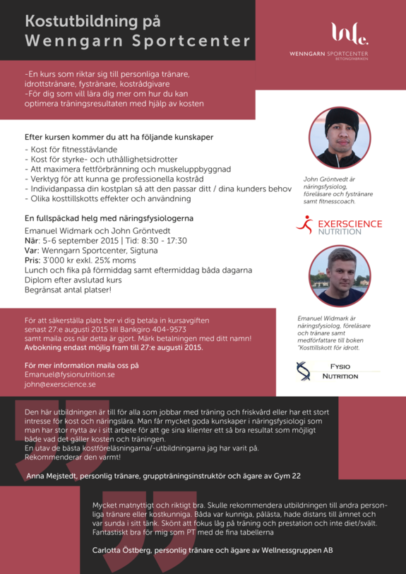 5–6 september håller näringsfysiologerna John Gröntvedt och Emanuel Widmark en kostutbildning på Wenngarn Sportcenter i Sigtuna. Du kan nu vinna en plats till denna fullspäckade helg genom att visa dina kunskaper!