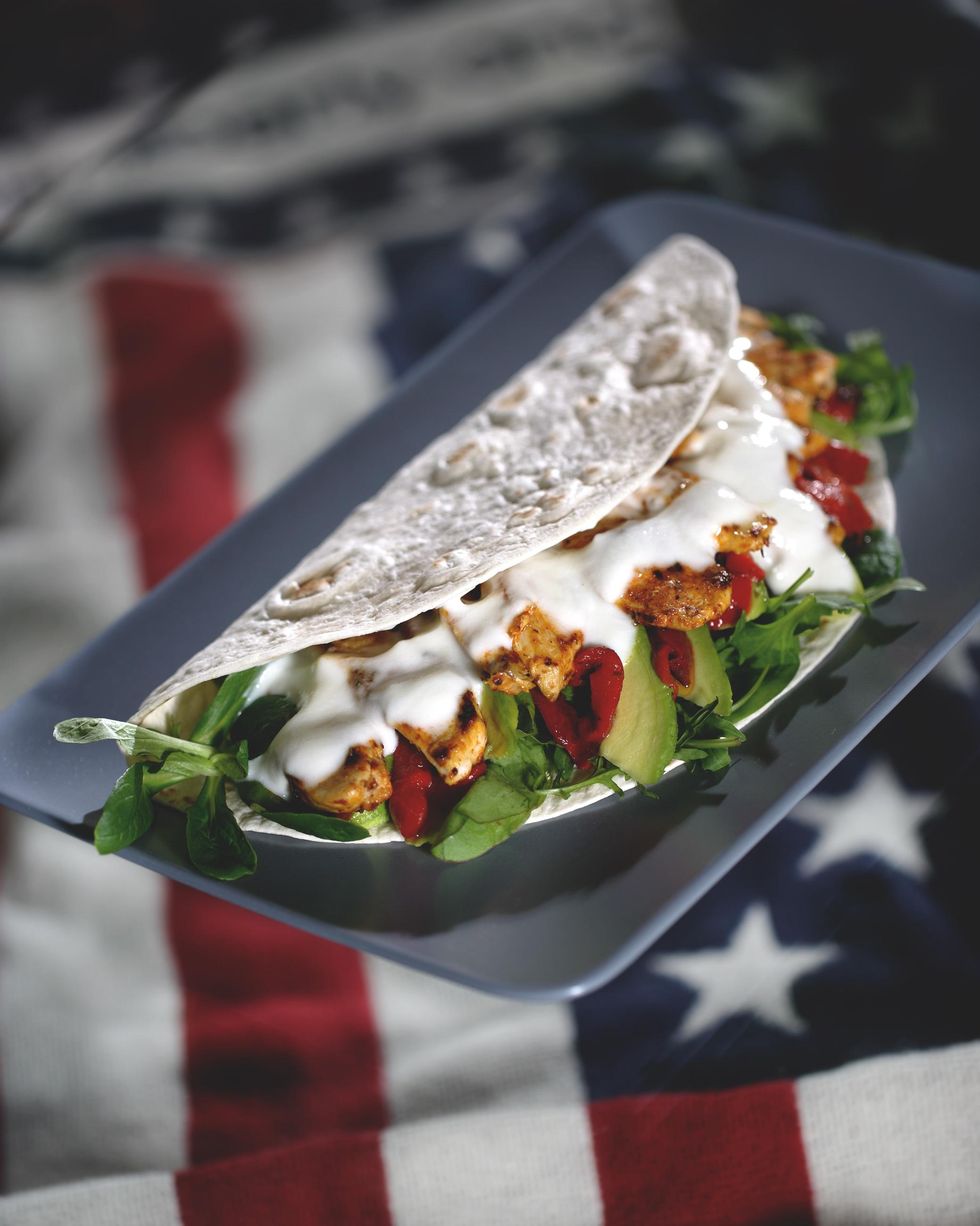 - Skiva avokadon och lägg skivorna tillsammans med sallad, grillad paprika och kyckling på tortillabrödet. Toppa med creme fraiche. Vik ihop och ät genast.
