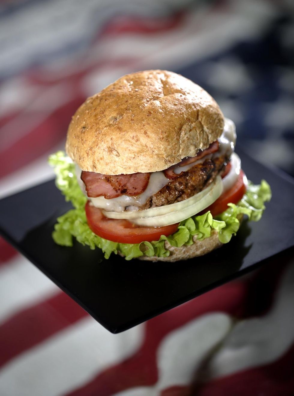 - Dela brödbullen och arrangera sallad, tomat, lök, burgare och bacon mellan brödhalvorna.