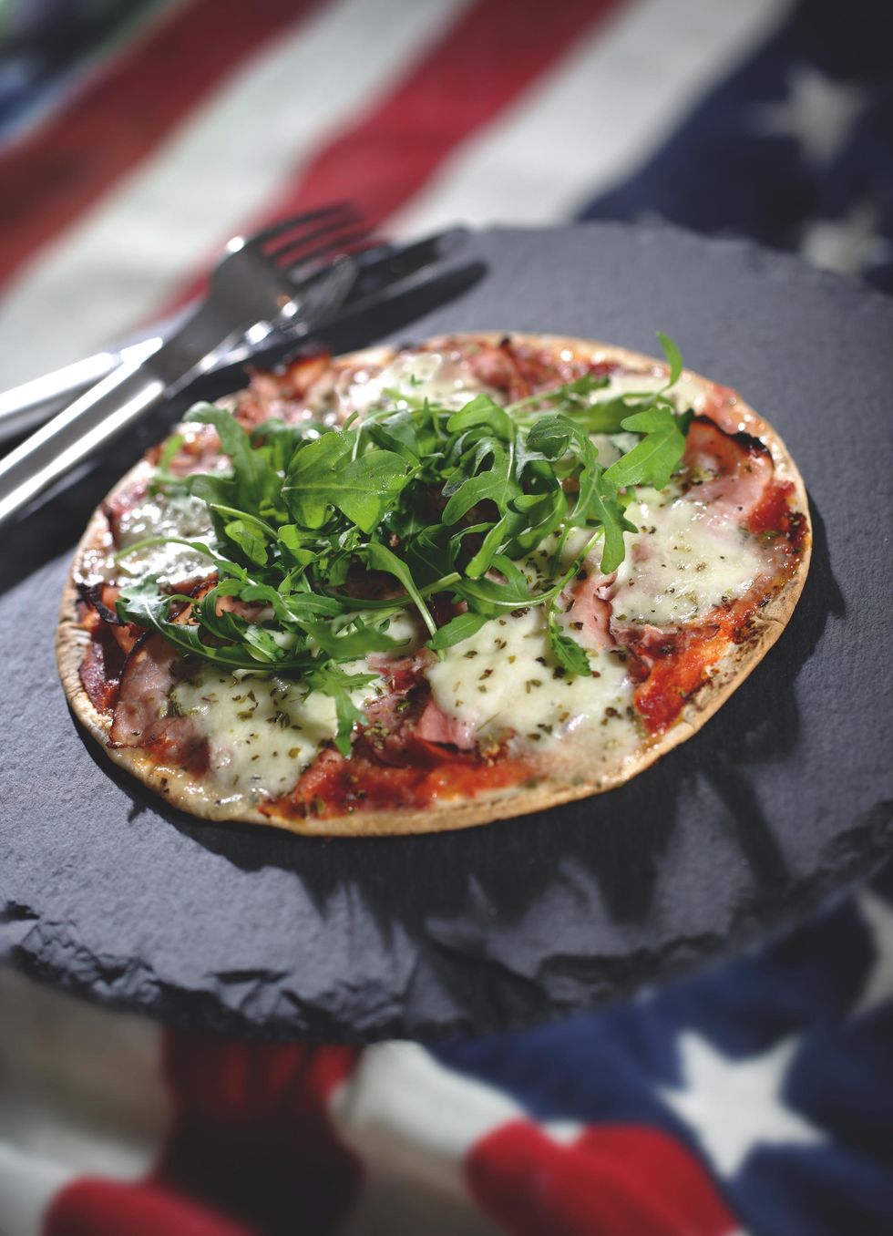 - Toppa den färdiggräddade pizzan med ruccola och servera genast.