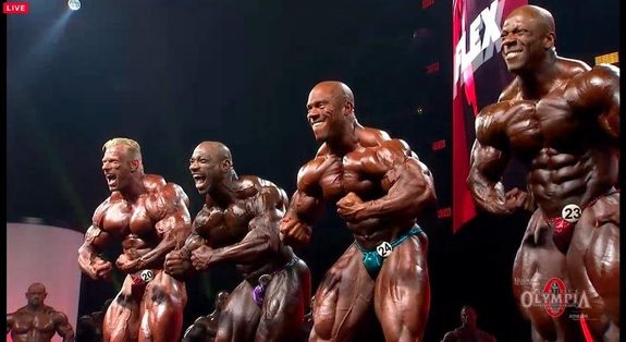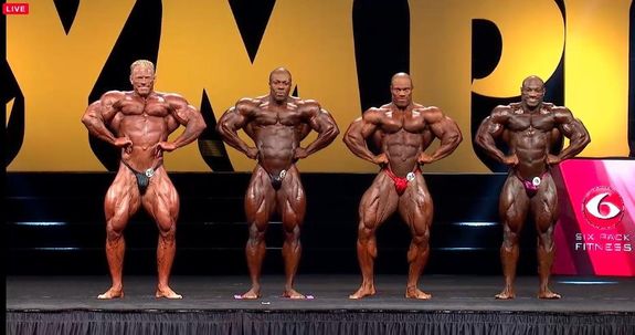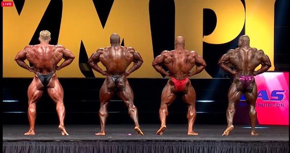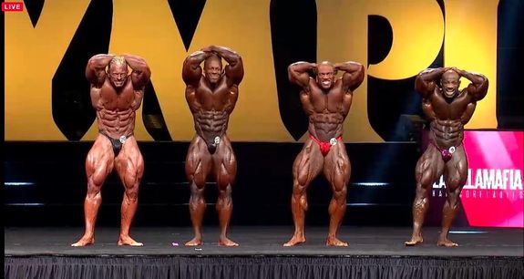 - Shawn Rhoden: Jag börjar känna igen poseringsmusiken, det är flera tävlande som gått upp till samma. Måste hålla magen tight hela tiden, mellan poser och på väg fram tappar han den och det ser inte bra ut. Annars, bättre än förra året… hård som tusan, grym.