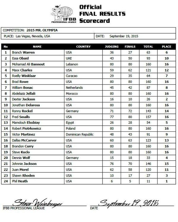 - Phil Heath: Unbeatable! Phil är ”on” och kanske till och med något större än sist, något bättre än förra året. Ingen slår detta… Pose för pose övertygar Phil och han står på scenen för att ta hem den femte vinsten.