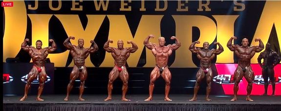 - Mamdouh ”Big Ramy” Elssbiay: 316 pounds (nära 144 kg), största Olympiern någonsin. Mäktig poseringsmusik, passar giganten som kommer upp på scenen med ett självförtroende vi inte sett tidigare. Han är inte helt ”on”, saknas lite dietande tyvärr. Ramy stod backstage och blev intervjuad av Flex Onlines kvinnliga reporter där, och h-lvetes j-vlar vad stor han är, biceps matchar hennes huvud.