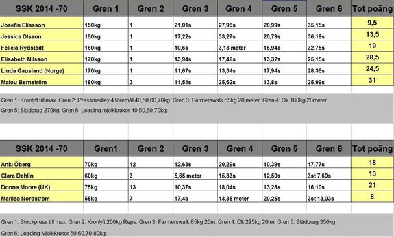 Grenarna inkluderar test av både maxstyrka, uthållighet och snabbhet. Tävlingen alterneras gren för gren mellan lätta och den öppna klassen: