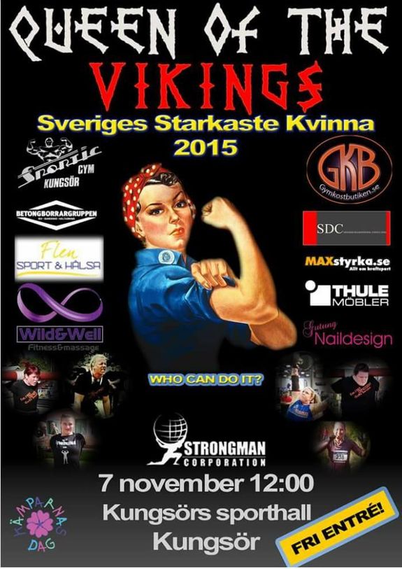 Lördag den 7 november avgörs Queen of the Vikings i Kungsör i två klasser: under 72.8 kg och en öppen klass – segrarna kan titulera sig Sveriges Starkaste Kvinna. De främsta kvalar dessutom till Arnold Amateur Strongwoman World Championships i USA!