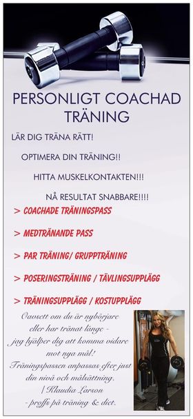 - Klaudia erbjuder personligt coachade träningspass, medtränande pass för personer med god träningserfarenhet, par- och gruppträning, kost- och träningsupplägg via månadsvis online coachning/support