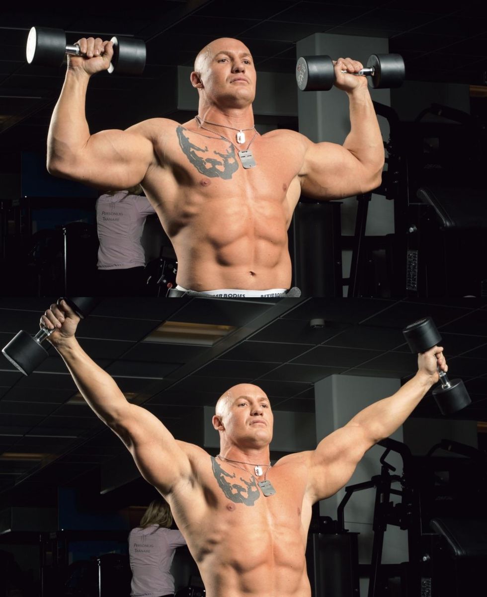 Sitt ned på en bänk utan ryggstöd. Placera hantlarna uppe vid axlarna. Pressa hantlarna uppåt och utåt som om du skulle forma ett V. Om du är riktigt kaxig pausar du en sekund i toppläget.