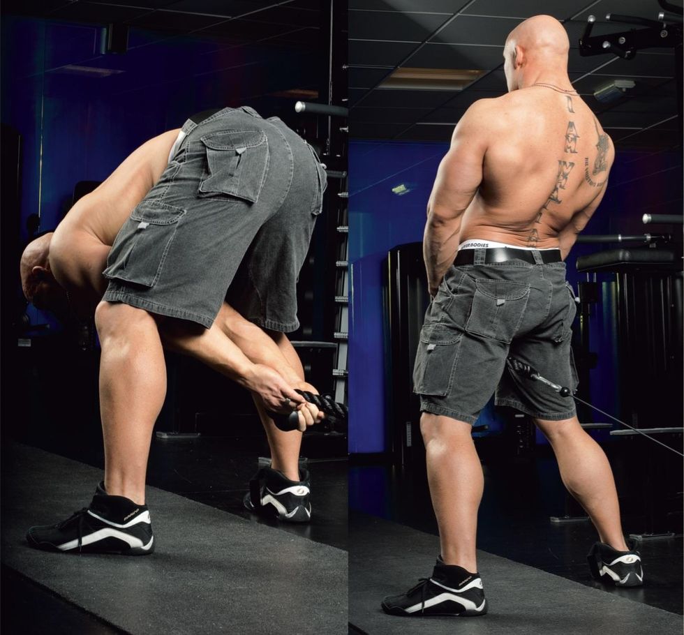Fäst handtag eller rep i nedersta trissan på en cable-cross. Stå vänd bort från trissan. Böj dig framåt och fatta tag i handtaget/repet och dra det fram mellan benen till dess att du står helt upprätt. Se till att du verkligen kniiiiper med rumpan på vägen upp, som Susanne Lanefelt skulle ha sagt. Dave Tate rekommenderar att man ska använda sig av ett relativt högt repsantal i denna övning, mellan 10-12 reps.