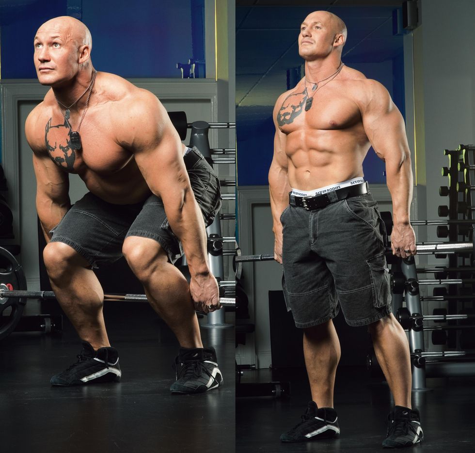Korsa sedan händerna och knyt dem. Lyft ut stången och ställ dig som om du ska utföra en knäböj. Spänn bålen och böj sedan på benen och sjunk ned till dess att stången nuddar låren, utan att tappa anspänningen i bålen. Återvänd sedan till ursprungsläget och tänk på att trycka fram höften när du trycker dig uppåt.