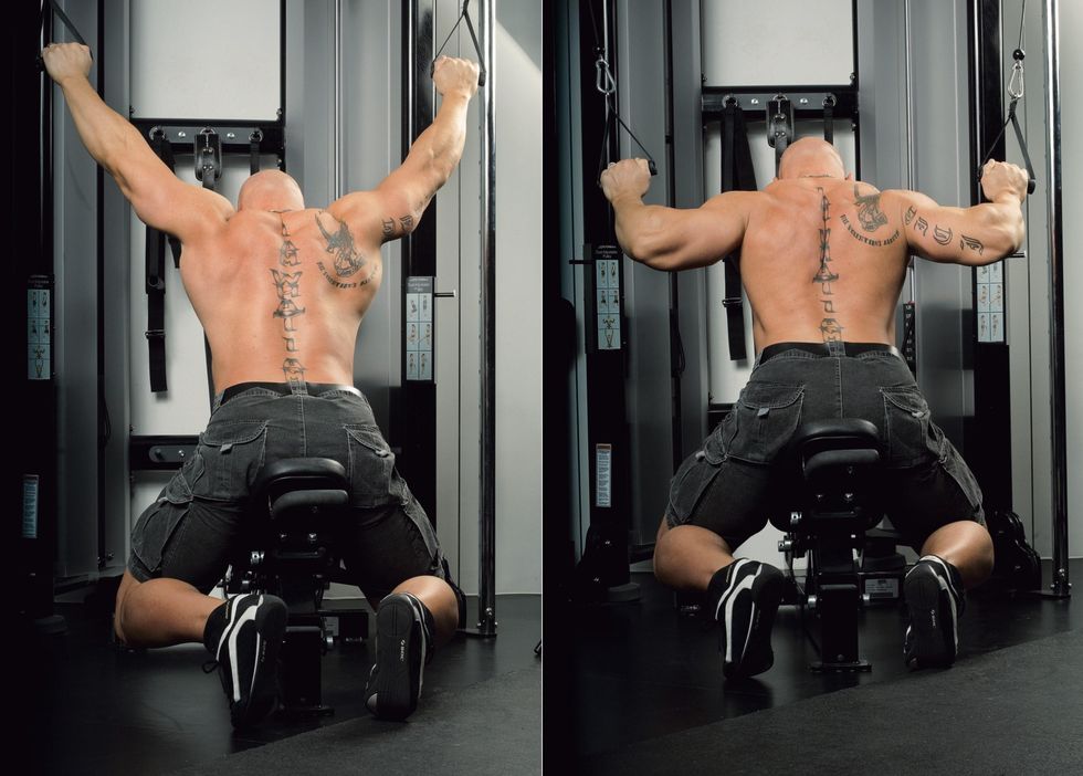 Fatta två handtag som är fästa i de översta trissorna i en cablecross. Sitt på en bänk och luta bröstet mot ryggstödet. Dra sedan handtagen nedåt och sikta på att nå revbenen med armbågarna, då detta ökar aktiveringen av latsen och teres major.