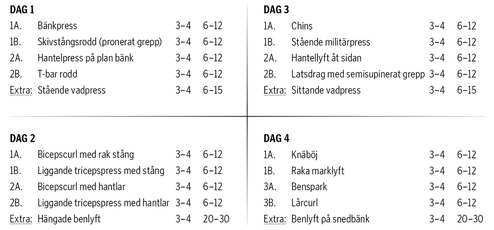 - Sikta på två övningar per muskelgrupp med 3–4 set per övning.