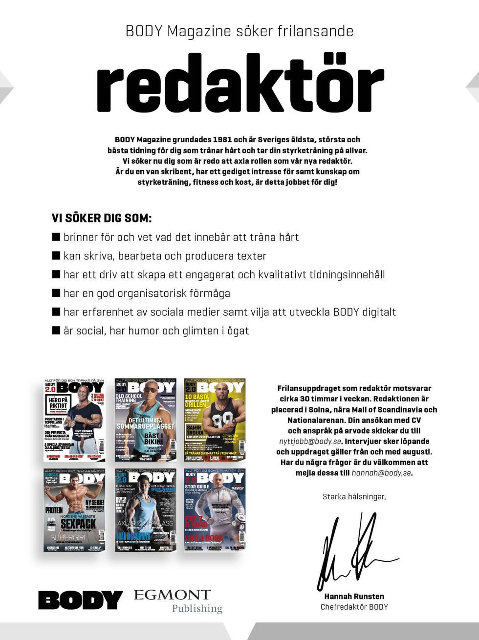 Frilansuppdraget som redaktör motsvarar cirka 30 timmar i veckan. Redaktionen är placerad i Solna, nära Mall of Scandinavia och Nationalarenan. Din ansökan med CV och anspråk på arvode skickar du till nyttjobb@body.se. Intervjuer sker löpande och uppdraget gäller från och med augusti.