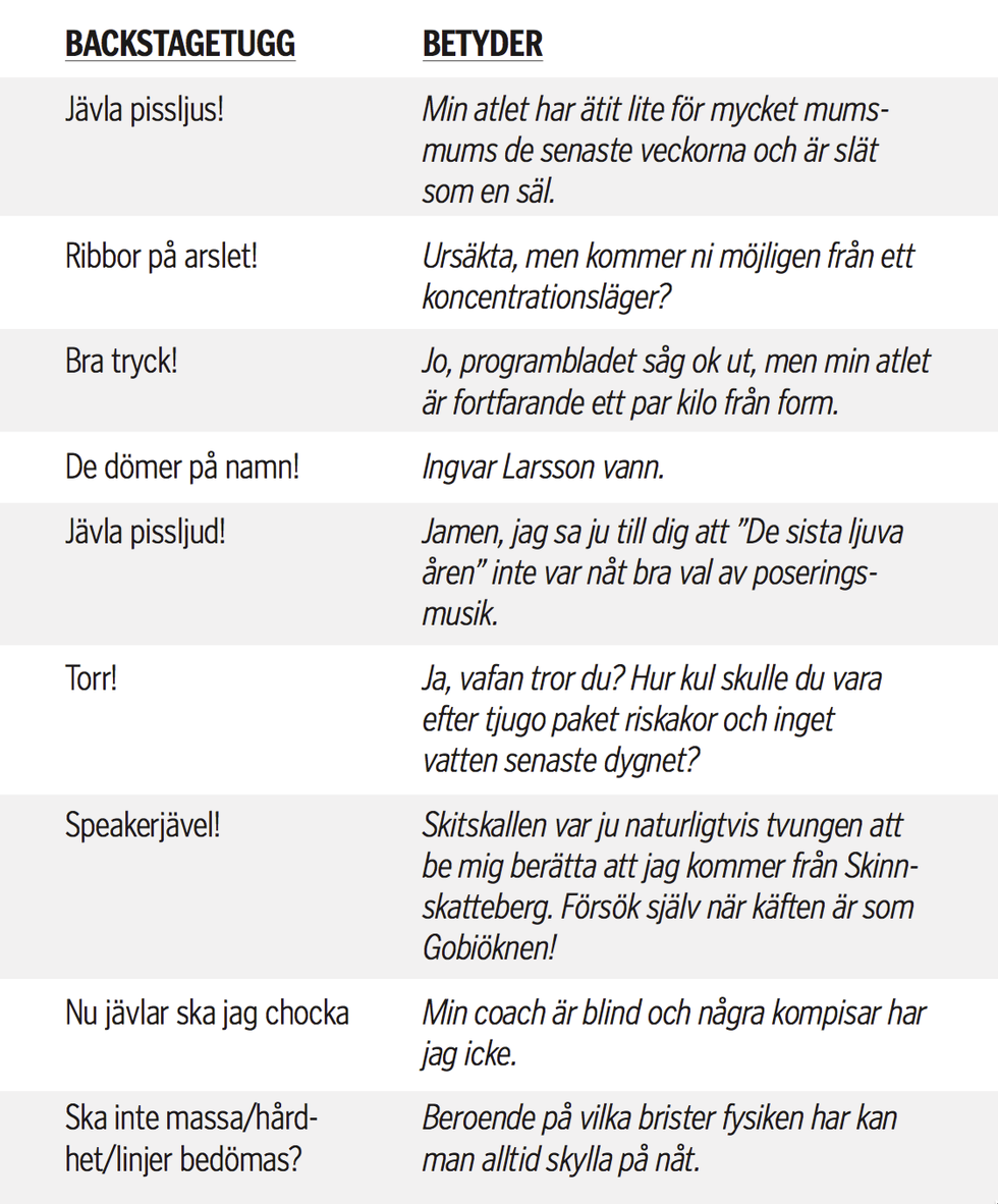 - Om en nummerlapp på något mystiskt vis fått vingar trollar den backstageansvarige fram en ny med rätt nummer och flyttar den dessutom till rätt sida av tävlingsdräkten efter att coachen tappat förmågan att skilja höger och vänster i nervositeten.