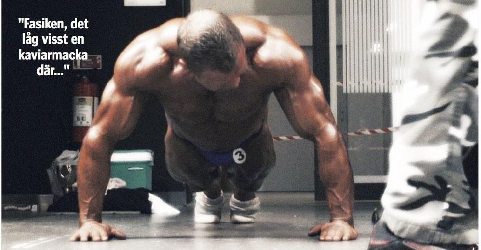 Sen ska det pumpas. Pumpa betyder att man gör samma sak med femkiloshantlarna som man gör med femtiofemkiloshantlarna på gymmet hemma. Det både låter och ser väldigt jobbigt ut.