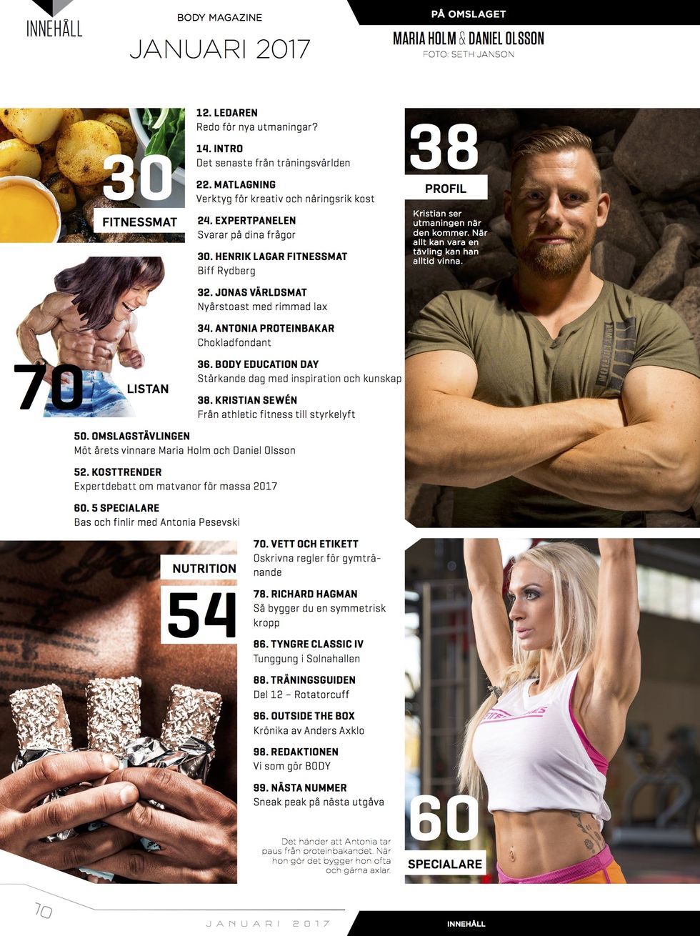 Januariutgåvan av BODY har de bästa styrketräningstipsen, forskningen om träning och kost, kostråden för mer muskler och mindre fett, personporträtten med de som har lyckats, skvaller och mycket annat.