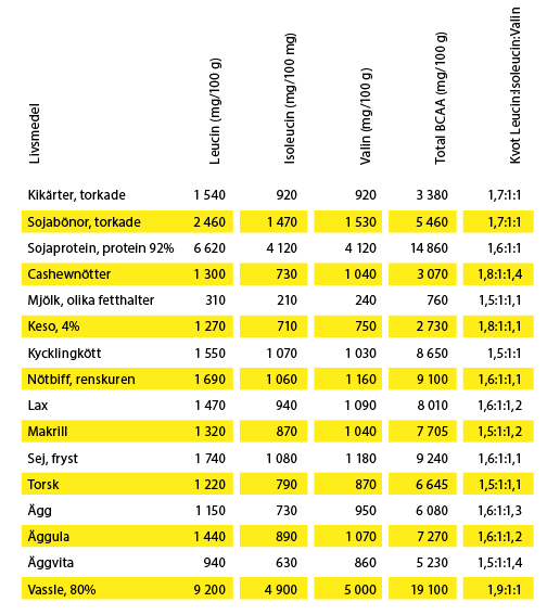 Källa: Specialtabell för aminosyror i livsmedel, tillgängligt online från: https://www.livsmedelsverket.se/globalassets/livsmedel-innehall/naringsamnen/livsmedelsdatabas/aminosyrorper100g.pdf