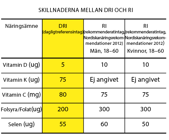 Värdet du ser på förpackningarna är egentligen ingen rekommenderad mängd, utan det som kallas DRI, dagligt referensintag. När det gäller exemplet D-vitamin, så är mycket riktigt rekommendationen 10 ug (som står för mikrogram) per dag. Men det dagliga referensintaget är satt till 5 ug. Lagen säger att det är DRI som producenten ska förhålla sig till när man uppger hur många procent av ett visst näringsämne som en produkt innehåller. Det här är väldigt förvirrande, eftersom många alltså tror att DRI och RI är samma sak – vilket det alltså inte är. ”Hajpen” om D-vitamin kommer av att vi på senare tid har förstått att detta vitamin har så många fler effekter än att ingå i skelettbildningen. Inte minst kan brist på D-vitamin påverka muskelproteinsyntesen negativt, vilket är ett nog så gott skäl till att äta fet fisk, D-vitaminberikade mjölkprodukter eller vegetariska alternativ och äggula. Ta del av extra D-vitamintillskott!