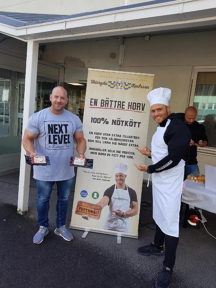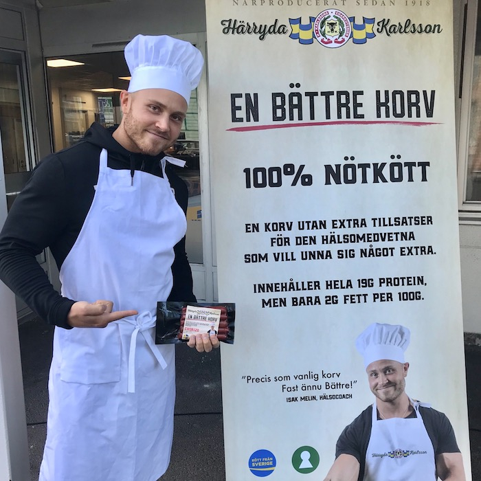 – Jag älskar mat, berättar Isak, och jag har alltid tänkt: ”Det måste komma en bra korv!” Jag finkammar affärerna. Det bästa som funnits är liksom Viktväktarnas korv med 50 procent morot, det är inte riktigt någon korv tycker jag. En av mina klienter hade firman Härryda Karlsson, en ganska etablerad charkleverantör här på Västkusten, och jag sa till honom: ”Jag tycker ni borde göra en bra korv! En korv med bra näringsvärde och råvaror för oss som tränar”. Han svarade tveksamt: ”Jaha, hur ska den vara då…?” När allt kom omkring tyckte han idén var bra men han kan inte den här kulturen, vet ingenting om vilka önskemål som finns här. Jag började rada upp: fettprocent si och så, helst inga kolhydrater och så vidare. Jag gillar att ha mycket saker på gång så jag fick bli lite galjonsfigur för projektet. Korven är gjord på 100 procent nötkött med endast två procent fett. Tio gram protein per korv. Den kommer snart ut i butik, först på västkusten, så snart som möjligt i hela Sverige. Ett paket med fem korvar, 250 gram, kommer att kosta 35-40 spänn.