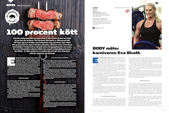 100% kött. Vi möter bodybuildern och karnivoren Eva Birath som berättar om hur hon modellerat om sin kropp, fått bättre värden och gått till ett friskare liv genom att utesluta allt som inte har med kött att göra. Kött e gôtt! Och även om du av olika skäl inte håller med om det, så är det här mycket intressant läsning ändå. Om du vågar gå utanför din comfort zone, vill säga.