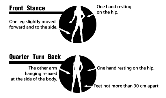 Ha en avslappnad men ändå upprätt hållning, med huvud och blick rakt fram. Håll ihop hälar och knän, samt stå med raka ben. Håll axlarna bakåt, men avslappnade, och låt armarna hänga avslappnade längs sidorna. Håll ihop fingrarna och låt fingertopparna lätt nudda dina höfter.